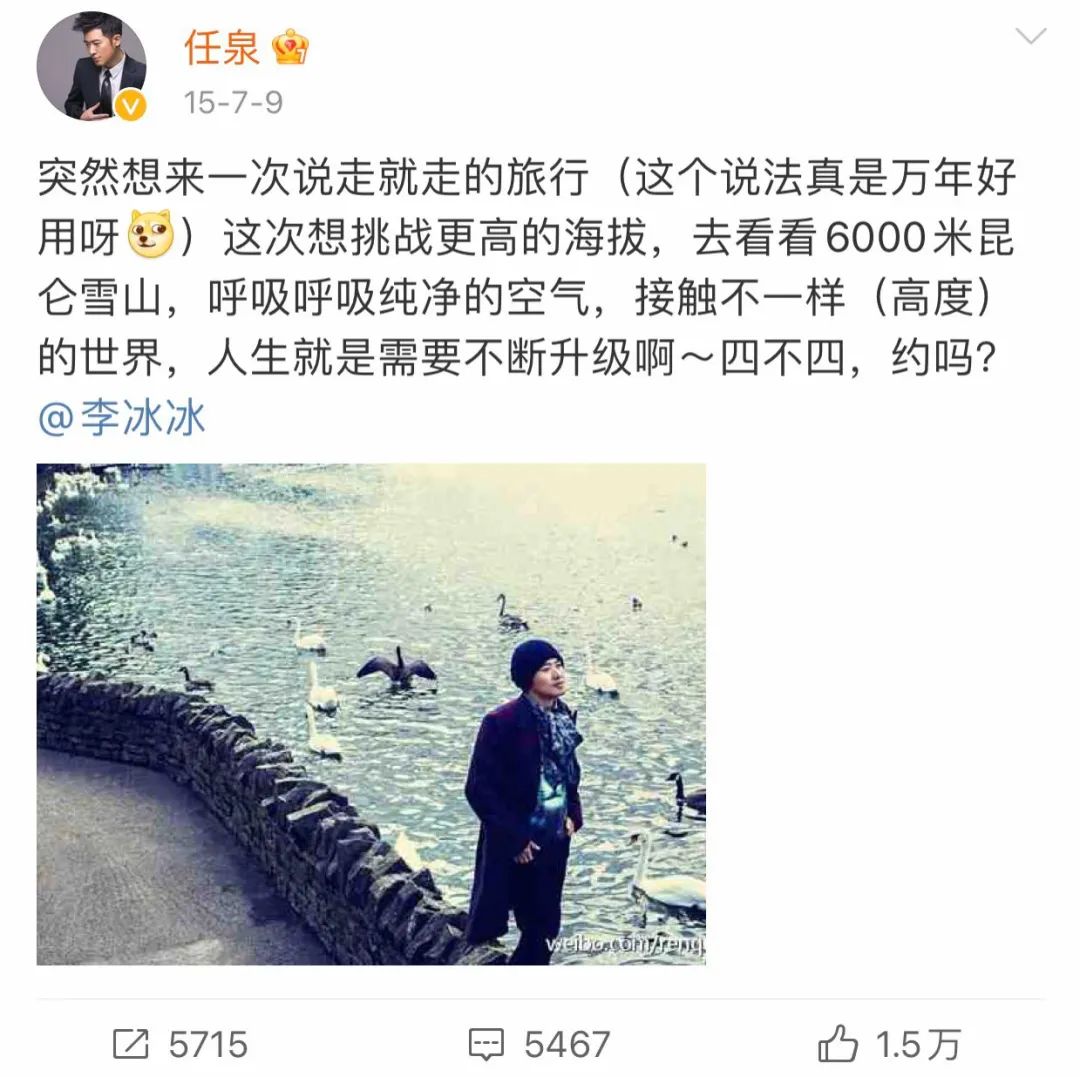 任泉曾发博说想有场说走就走的旅行,去海拔6000米的雪山看看。