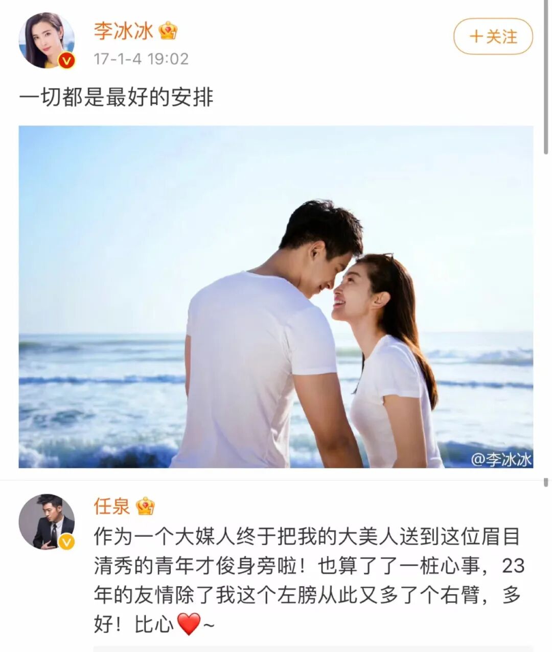 不管是从出处,还是从摊入社会,任泉和李冰冰简直就是一对形影不离的好朋友,可以说两位演员青梅竹马。2017年1月4号任泉曾爆料,他曾经还给女方介绍过男友,把身边遇到的青年才俊推荐给李冰冰。虽然后来李冰冰和男友分手了,不过任泉依然陪伴在李冰冰的身边,他们的友谊比爱情更加珍贵。他多年前曾在综艺里说:如果多年后她未嫁我未娶,就凑合一起过吧!