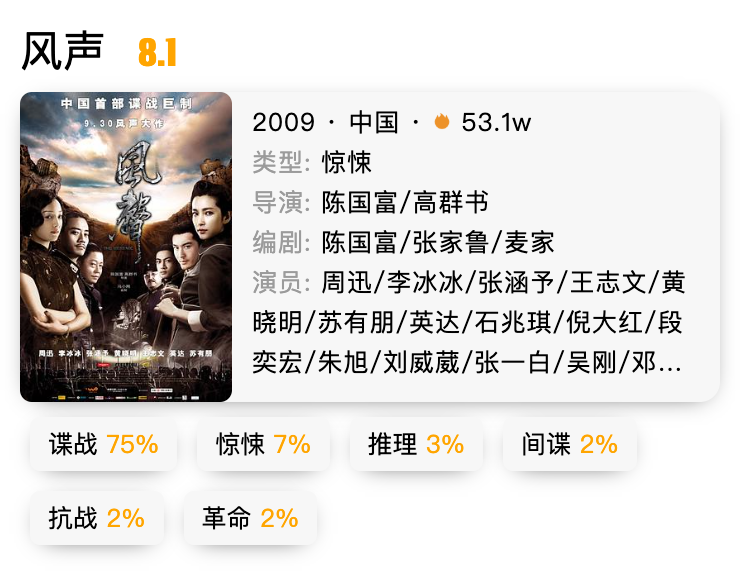 《风声》是由高群书、陈国富联合执导,周迅、李冰冰、张涵予、黄晓明主演的谍战片,于2009年9月29日在中国内地上映。该片改编自同名小说,讲述了抗战时期一名汪伪政府的高官被暗杀后,日军要彻底搜查抗日地下组织,从而引发的一系列惊心动魄的故事。