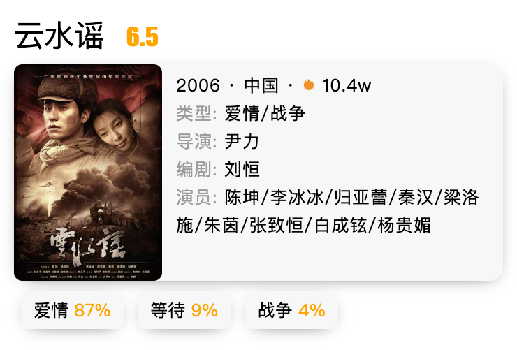 2006 年,李冰冰参演陈坤电影根据张克辉《寻找》改编爱情电影《云水谣》,这部影片讲述了一段跨越海峡、历经60年大时代动荡背景下,至死不渝的坚贞爱情。李冰冰在影片中饰演的是王金娣 ,上海人,护士。19岁参加抗美援朝战争,结识陈秋水,并对他一见钟情,自此一路追随他。后陈秋水被其真情感动与之结婚,李冰冰也获得了第29届大众电影百花奖最佳女主角!