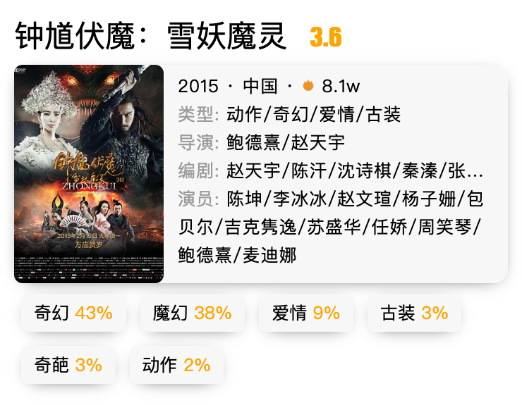 2015年,李冰冰和陈坤主演《钟馗伏魔:雪妖魔灵》,这部影片讲述了斩妖士钟馗保卫扈都降妖伏魔的故事。李冰冰在影片中饰演的是雪晴,冰雪美人,风华绝代。她与钟馗有一段难忘的恋情,片中李冰冰一身白衣,雪妖造型十分美丽。