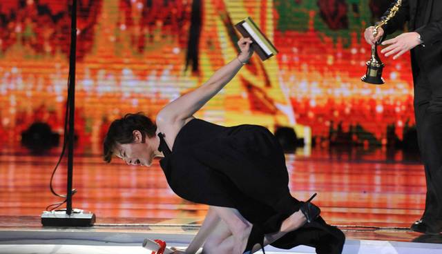 而就在上周的北京国际电影节闭幕式上,作为第一个奖项颁奖嘉宾的梁咏琪登台时不慎滑倒。恰好当时切了一个中景镜头,这一切也都呈现在了电视直播画面上。