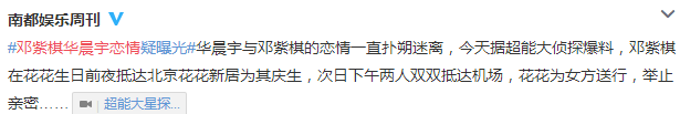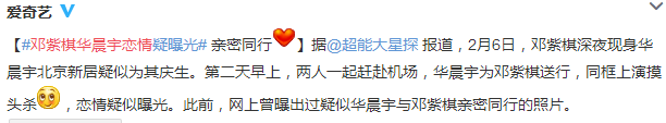 “据全明星探报道,2月6日,邓紫棋深夜现身华晨宇北京新居疑似为其庆生。第二天早上,两人一起赶赴机场,华晨宇为邓紫棋送行,还亲密摸头,恋情疑似曝光。此前,网上曾曝出过疑似华晨宇与邓紫棋亲密同行的照片”