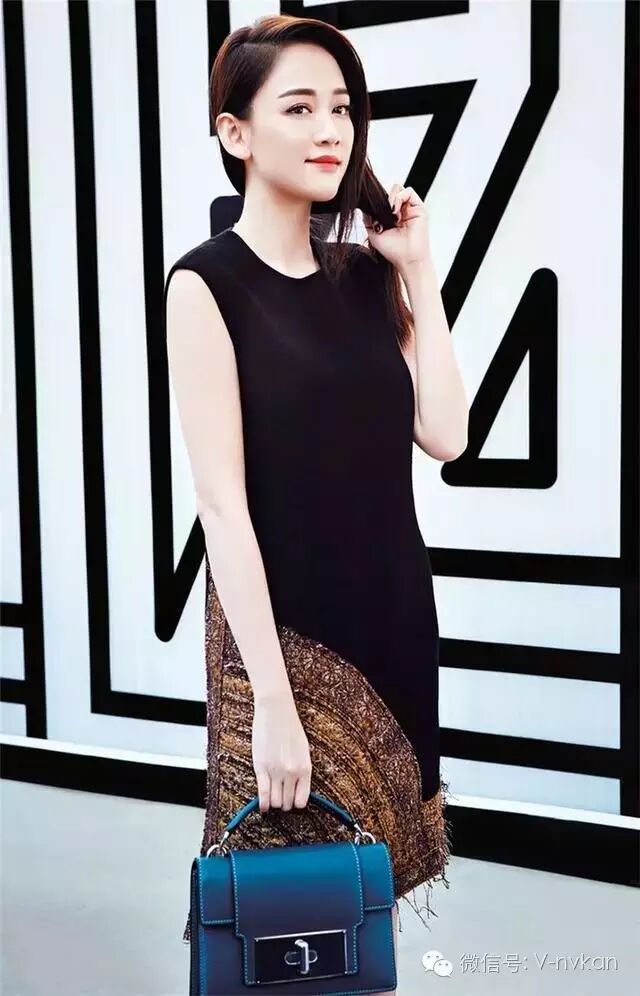 黑色的无袖裙,裙角弧线式粗毛的点缀,让裙子更有设计感,拿手提包,很知性干练。