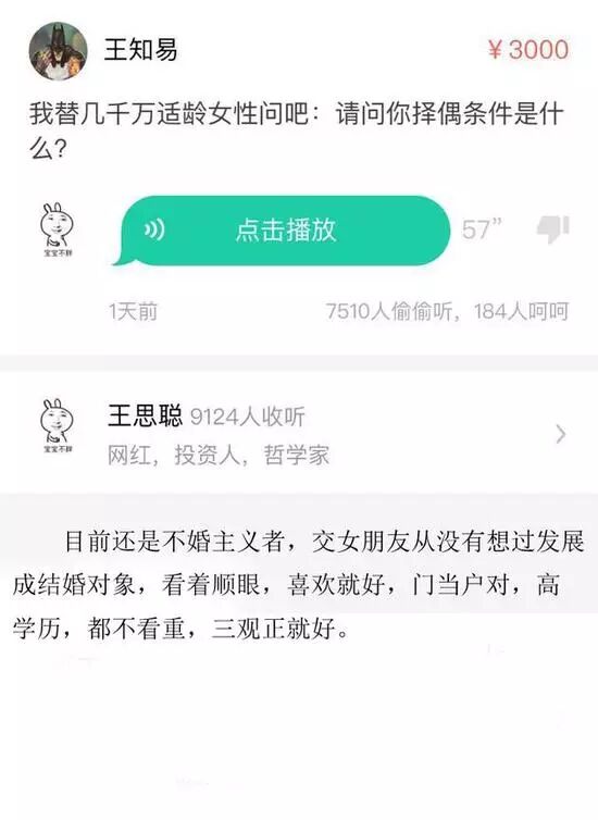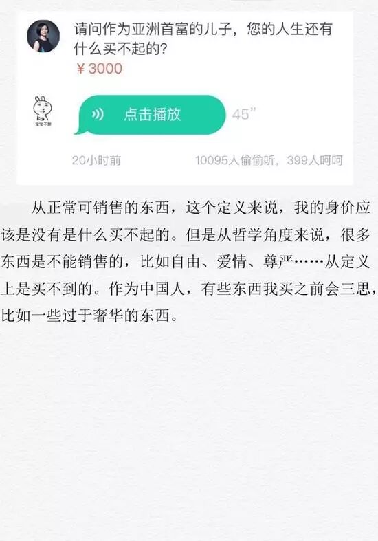 首富之子买不起什么?王思聪回答:“从正常可销售的东西,这个定义来说,我的身价应该是没有是什么买不起的。但是从哲学角度来说,很多东西是不能销售的,比如自由、爱情、尊严……从定义上是买不到的。作为中国人,有些东西我买之前会三思,比如一些过于奢华的东西。”