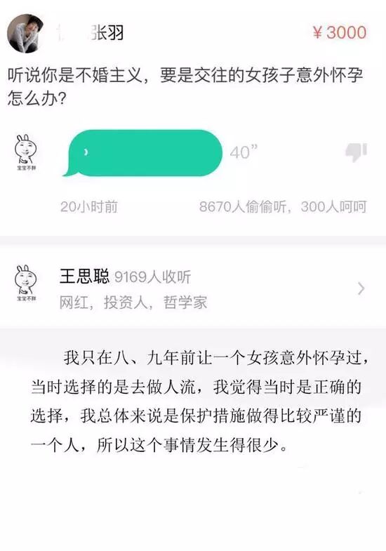 近日,王思聪开通某问答平台,某医院医生张羽在该平台中向王思聪提问:“听说你是不婚主义,要是交往的女孩子意外怀孕怎么办?”在40秒的回答中,王思聪爆料自己毫不手软:“我只在八、九年前让一个女孩意外怀孕过,当时选择的是去做人流,我觉得当时是正确的选择,我总体来说是保护措施做得比较严谨的一个人,所以这个事情发生得很少。”