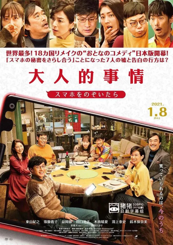 影片讲述了在一次聚会中,大家把自己的手机信息开诚布公,从而引发的连锁事件。片中,东山纪之饰演单身男性小山三平,铃木保奈美和益冈彻饰演一对五十多岁社会名流夫妇,常盘贵子和田口浩正饰演处于婚姻倦怠期的园山夫妇,木南晴夏和渊上泰史饰演新婚的向井夫妇。