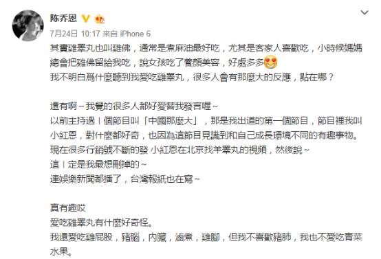 遭到很多人质疑其恶兴趣,陈乔恩发微博委婉指责营销号