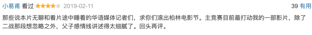 比如著名的德语字幕组小某甫,在《外出偷马》的短评里,他让那些给这部电影打差评的华语媒体们都赶紧滚蛋。
