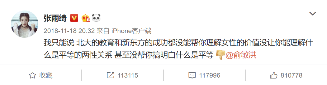 一席话罢,立刻遭到包括张雨绮在内的网友痛骂反击。