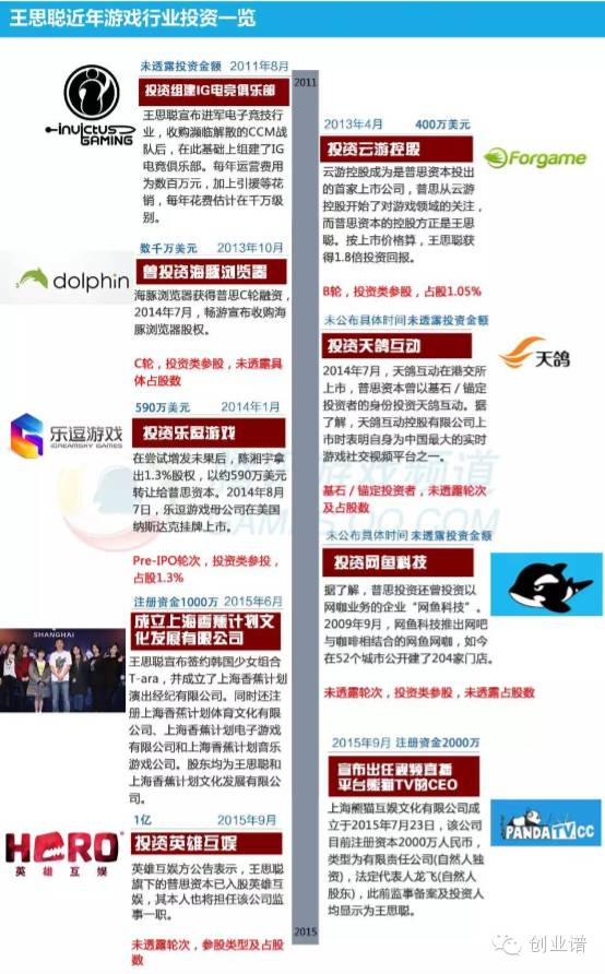 2015年9月,创立游戏直播平台熊猫TV和香蕉计划,再以1亿元人民币投资英雄互娱。