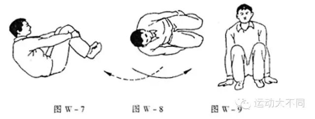 锻炼法如图示:做熊戏时,身体仰卧,两手抱着小腿 (图W-7)抬头,身体先向左滚着地,再向右侧滚着地,左右滚转各7次(图W-8)。然后屈膝深蹲在地上,两手在身旁按地,上体晃动,左右各7次(图W-9)。