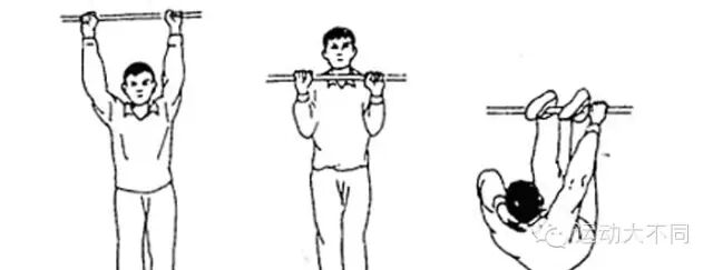 锻炼法如图示:做猿戏时,身体直立,两手攀物(最好是高单杠),把身体悬吊起来(图W- 10),上下伸缩7次,如同“引体向上”(图W-11)。在两手握杠、两脚钩杠的基础上,做一手握杠、一脚钩杠,另一手屈肘按摩头颈的动作,左右各7次 (图W-12)。手脚动作要相互配合协调。