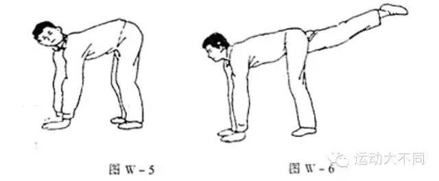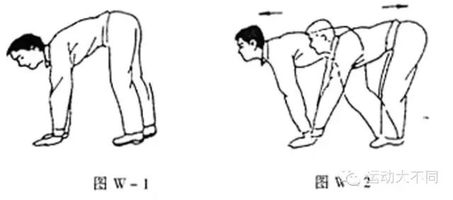 锻炼法如图示:做鹿戏时,手脚仍着地,伸着脖子往后看,向左后方看3次,向右后方看2次,即左后右后、左后右后、左后 (图W-5);继而脚左右交替伸缩,也是左3次,右2次(图W-6)。
