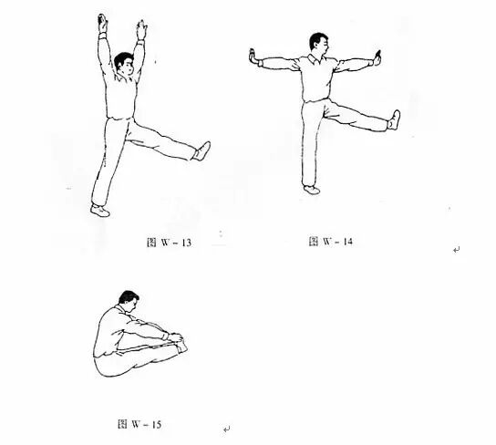 锻炼法如图示:做鸟戏时,双手臂向上竖直,一脚翘起,同时伸展两臂,扬眉鼓劲,模仿鸟的飞翔(图W-13、图W-14)。坐在地上,伸直两腿,两手攀足底,伸展和收缩两腿与两臂,各做7遍 (图W-15)。