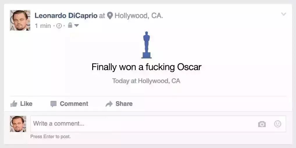总之,今天无论是全世界的娱乐版面,还是你们的朋友圈,都将被雄起的小李子霸占,今夜我们都是小李子!