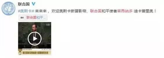 联合国已向小李子发来贺电,深深的为“和平使者”莱昂纳多·迪卡普里奥而感到开熏 ↓ ↓