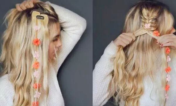 STEP1:先将头发分好区,如果发量少,或者希望编发更有少女气息,可以用带有装饰的拼接发片。