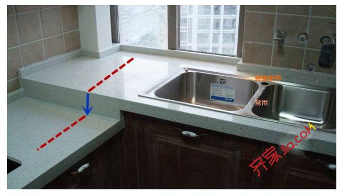 水槽、操作台为高区,燃气灶为低区。