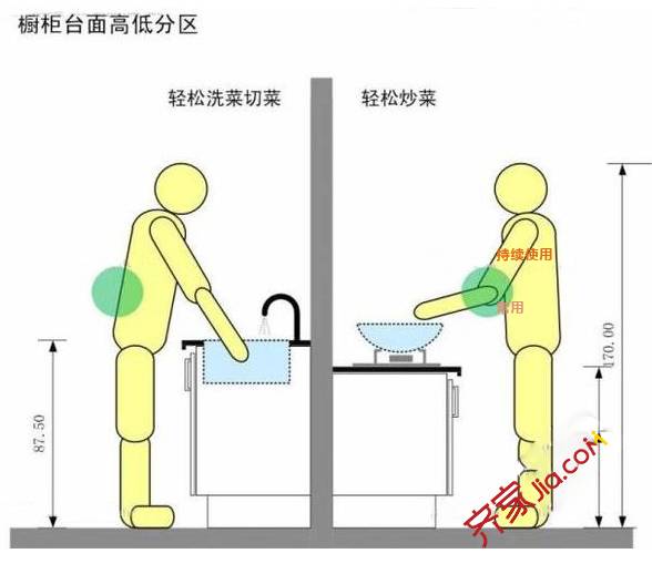 根据人体工程学原理,橱柜工作区台面,应划分为不等高的两个区域。