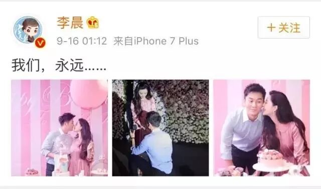 发出的微博图片里,李晨单膝跪地地给冰冰戴戒指。