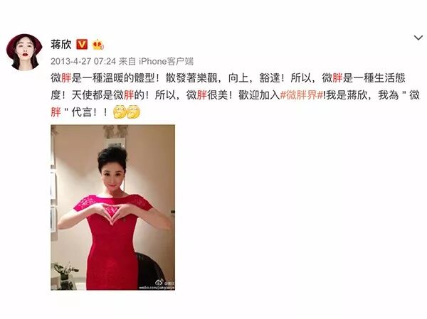▲蒋欣本人对于“微胖”的理念也并不反感,甚至还摇身一变做起了微胖女孩的代言人~
