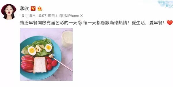 ▲其实编辑认为,不管是胖还是瘦,最重要的是身形体态看上去好,生活健康规律,不能因为盲目想瘦就尝试一些不科学的减肥方法,这点蒋欣就做得非常好,每天的早餐都是健康饮食,比姑娘们白天不肯吃晚上点外卖要好很多~