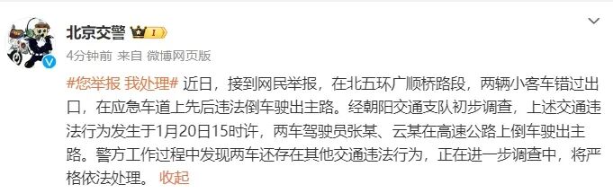据@北京交警微博消息,近日,接到网民举报,在北五环广顺桥路段,两辆小客车错过出口,在应急车道上先后违法倒车驶出主路。经朝阳交通支队初步调查,上述交通违法行为发生于1月20日15时许,两车驾驶员张某、云某在高速公路上倒车驶出主路。警方工作过程中发现两车还存在其他交通违法行为,正在进一步调查中,将严格依法处理。