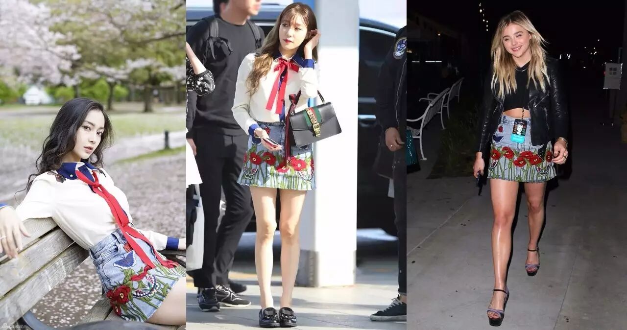 ↓↓↓同样来自GUCCI的刺绣牛仔裙,这裙子可是世界级的抢手货,受到各地女神的喜爱。不过大家貌似都喜欢以同品牌衬衫来搭配,像孔孝真这样用一件简洁的白色针织衫搭配起来,虽然没这么出挑,但却提升了时尚与性感程度,个人更喜欢后者。