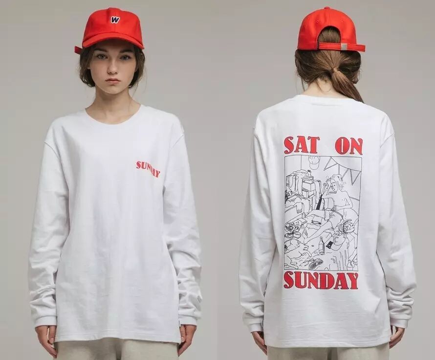 另外还喜欢下面这两件啊!~白色的是来自Wkndrs的SAT ON SUNDAY LONGSLEEVE TEE,男女同款,还有蓝、黑、米色可选,售价约500rmb。