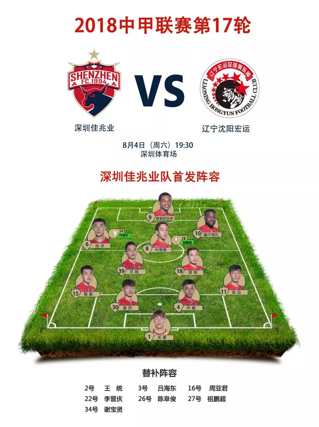 本场比赛,深足对首发名单做了调整,奥汗德扎代替上轮首发的迪巴,徐洋替下祖鹏超首发,乔巍顶替王大龙首发。