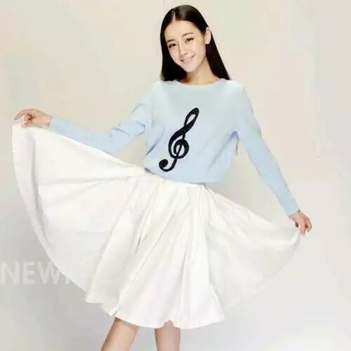 浅蓝色的音符针织套头上衣搭配白色的半身裙,小清新色系搭配,非常小清新文艺范。