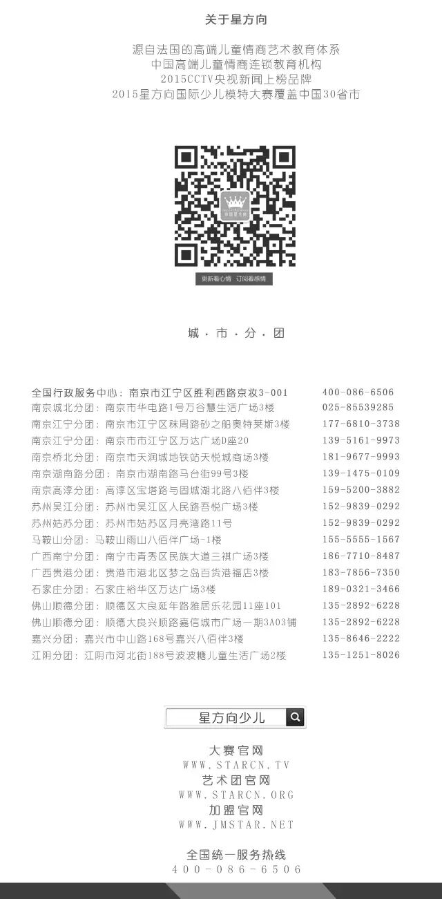 [江宁万达]2016国际婚纱儿童摄影展,分团小萝莉阿朵荣登... 星方向总部 内地女星 2016-02-26 18:46:45 543 创作不易,用心坚持,欢迎请BaGua喝几杯爱心咖啡!打赏并支持本文 打赏并删除本文 江宁分团飞出小明星 “2016中国·上海国际儿童摄影展览会(春季)”(以下简称“上海儿童摄影展”)将于2016年2月23-26日移师至上海新国际博览中心(浦东新区芳甸路花木路口)举办。目前招展工作已基本结束,展出规模较上届增长50%,达近20,000平方米。星方向少儿情商艺术团江宁万达分团的小萝莉——阿朵 荣登本次会展! 从星方向少儿艺术团走出的宝贝就是不一样~咱们看看孩子的风采! 因此,还觉得你家孩子还小,觉得自己家孩子不够出众的家长,就不要再犹豫了,把孩子交给星方向,我们给回你一个自信阳光的小天使,一切快乐活动和舞台尽在星方向。 咨询联系电话:星方向少儿情商艺术团江宁万达分团 139-5161-9973 地址:南京市江宁区万达广场D座20楼-星方向少儿情商艺术团 我们有惊喜和优惠相送哦! 创作不易,用心坚持,欢迎请BaGua喝几杯爱心咖啡!打赏并支持本文 打赏并删除本文 感谢您的支持鼓励,我会继续努力的!文章地址:用户邮箱:打赏金额:USDT 请输入数字点击”去打赏“,即可进行打赏支持本文章哦 About the Author 星方向总部 功能介绍:中国高端儿童艺术教育,总部位于中国上海,业务涵盖:艺术教育投资、影视投资、电视节目制作、大型赛事、品牌连锁。旗下知名业务品牌:星方向少儿情商艺术团和星方向国际少儿模特电视盛典。 Related Posts 你知道吗?除了傅恒侍卫,他们也是模特出身! 2018-09-07 19:04:29 [江宁万达]2016国际婚纱儿童摄影展,分团小萝莉阿朵荣登... 2016-02-26 18:46:45 发表评论