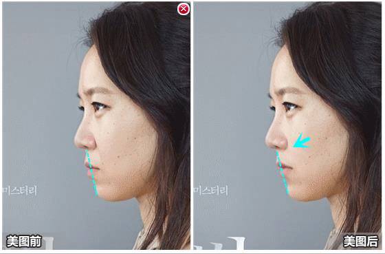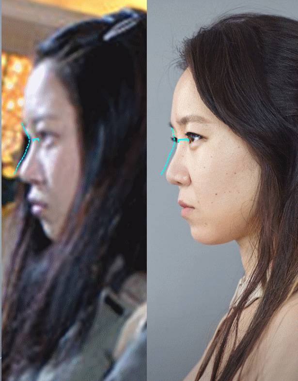 所长找到两个大侧脸的图P了一下,先看孝真欧尼的对比图,把鼻基底填充一点,再把嘴凸拉进去一点,是不是看起来比例好看了许多