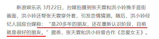 这对古早台偶CP居然在一起了? 腾讯娱乐 港台女星 2023-03-24 21:27:26 78 创作不易,用心坚持,欢迎请BaGua喝几杯爱心咖啡!打赏并支持本文 打赏并删除本文 点击上方“腾讯娱乐”并关注,在这里读懂娱乐圈今天也是被不可思议的恋情瓜震惊到的一天。娱乐圈进入什么CP都能神奇组装的新时代了吗?给大家复盘一下内容 ↓事情是这样。前几天台媒不是拍到人在台湾的吴奇隆带着儿子全家合体为妻子刘诗诗庆祝36岁生日么。一家三口合体庆生/探亲/会友,基本上再次侧面辟谣了频频出现的婚变传闻。原本以为这场生日宴的功能纯粹只是为了力证刘诗诗吴奇隆婚姻依旧。没想到居然另有玄机,暗藏新瓜耶。台偶年代让人惊艳的情怀女二洪小铃 ↓大家有印象吧?一部《放羊的星星》就能通杀一代观众的儿时记忆。戏里演的欧雅若虽然是恶毒女二,但角色坏得有血有肉有逻辑,让观众对她既厌恶又同情。洪小铃本人也让观众眼前一亮。有不输女一号的美貌。演技也在线,演出了反派的不择手段,也演出了角色背后的无奈和不甘。《放羊的星星》播出后收视口碑齐齐大爆,按理说演员们都有机会齐齐飞升,洪小铃也用表现证明了自己的美貌和演技都配得上演女主。但在那个审美取向是温馨傻白甜女主的偶像剧年代,甜美邻家比美貌智慧更重要,洪小铃这种外形气质偏凌厉美的类型,往往会因为过于美艳只能屈居女二,用来衬托贫苦乐观自强不息傻白甜女主。也因此洪小铃没得到多少上位机会,基本以演重要女配为主,偶尔演演群戏。有这种待遇的美女不少,许玮甯、林韦君、白歆惠都是这么熬过来的,连超级有钱有背景的第一千金关颖入行演偶像剧,也一样只能演演美艳女二。只能说,吃了时代取向的亏也挺无奈。后来洪小铃也来内地发展过一段时间。演了芒果台的《单身公主相亲记》,给彼时的芒果主持人赵靓做配。《完美丈夫》里依然是女配,给戴娇倩做配。签约林心如公司后,连续演出了几部林心如制作的剧。《倾世皇妃》里戏份颇重的女二。以及《秀丽江山长歌行》。倾世皇妃让洪小铃在内娱有了点存在感,也接拍了不少内地戏,但可惜后续她的事业并没有飞升。最后没过几年就从内娱撤退,慢慢消失在了观众眼前。很多观众对洪小铃没能走红意难平,认为她不论美貌还是演技或是作品完全有资格上位,却成了贵圈的遗珠,对她很不公平。这种言论流传到最后,居然把洪小铃没红的原因归咎于“林心如出于忌惮打压自家艺人,签了洪小铃又不给机会,耽误了她的发展”。讲真,这话就有点牵强了。残忍点说,事实就是洪小铃尽管靠女二角色让观众惊艳过,留下过深刻记忆,但她整个演艺生涯都没能得到上位女主的机会。不管是签约林心如之前,还是签约林心如之后,她一直都是演配角,包括来内地拍的一系列剧,不管女主是当红的大明星,还是跨界演出的新人,洪小铃都只能给人演配角。留给观众印象最深刻的,也依然只有很久之前的恶女形象。在林心如制作的重头剧里演戏份颇重的女二号,其实已经是她后期得到的不错机会了。没能成功,缺了点运气。这在娱乐圈,其实挺常见。她自己看得通透。还特意转发微博替前老板林心如解释澄清,没人耽误她,希望大家不要这么说话。直到今年,她和林心如也一直保持友好关系,会给前老板生日点赞。心态一直都蛮好。日子过得也没观众想象的那么惨。没红,但一直有拍剧,有演出,这几年还演了不少口碑不错的剧。客串《台北女子图鉴》↓参演《正义的算法》↓其实事业一直都没放弃过。演艺这条路走得不算顺,但20年没被淘汰,其实已经是幸运的演员了。洪小铃是1978年出生,今年45岁了。因为年纪变化,她在情怀盘点素材里,话题也由当初“最美女二候选人”变成了“至今单身的台偶女二”。转折点发生在吴奇隆给刘诗诗庆生这天。洪小铃的新恋情意外被爆了光。交往对象更是让人震惊不已。脱单这种事吗,往往就在一瞬间。洪小铃被拍到白天陪着新男友一起逛街选礼物,晚上参加新男友的友人(也就是吴奇隆)聚会。桃花就这么悄悄来了。实不相瞒大家。一开始看到画面的第一感觉是。洪小铃咋回事,居然找了个看起来肚大腰圆外形麻麻的中年大肚男。可是再仔细一看。这个发福男。咱们都认识啊。——张天霖。台偶男演员,演过《土司男之恋》、《我的秘密花园》等知名偶像剧。原来不这样。年轻时模特出身,身高身材都是优势。长相也是可以的,干净清爽型。后续事业没太大起色,没成为记忆里的帅气男主角就算了。居然在无人发现的角落,默默发福成这样?很难让人不震惊吧……都不知道是恋情更让人意外还是男神外形崩坏更让人惊呆。讲真,如果不是外形落差过大,这对原本还蛮好磕。也是一个兜兜转转遇到你的故事。初出道不久就认识。17年前合作过《恋爱女王》。戏里洪小铃向张天霖贡献了银幕初吻,张天霖也当众表示过被洪小铃吸引,对她有好感。多年前没接受示爱。17年后从老友变成了爱情。也算奇妙缘分了。看了下时间表。两个人友情蜕变爱情时间确实不长。去年8月洪小铃还在庆祝单身万岁。这么算这段恋情撑死也不超过半年。恋情曝光后洪小铃方也回应得很安全保守,说重新认识阶段,开始接触发展。不过从拍到的画面看:牵手摸头 ↓贴心帮穿外套 ↓已经非常自然进入情侣模式了。看样子重新认识相当