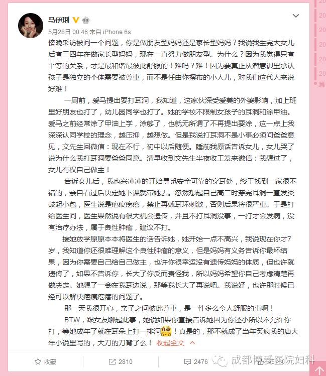 碰到这样的情况不用太紧张,不防借鉴一下马伊琍的做法:爱马提出打耳洞,马伊琍首先和文先生商量,问一下先生的建议,文先生回微信:现在不行,初中以后随便。睡前她原话告诉女儿,女儿哭了说为什么我打耳洞要爸爸同意。清早又收到文先生半夜收工发来微信:我想过了,女儿有权自己做主!于是她开始为女儿寻觅安全可靠的穿耳处,后来咨询得知自己高二时穿完耳洞一直发炎鼓起小包,医生说是疤痕疙瘩,禁止再戴耳环刺激,否则后果将很严重。于是打给医生问,医生果然说有很大机会遗传,并且不打耳洞没事,一打才会发病,没有治疗办法,属于良性肿瘤,建议不打。接孩子放学时原原本本将医生的话告诉她,她开始一点不高兴,我说现在你才7岁,我知道你还很难理解这个良性肿瘤的意义,但是妈妈有义务告诉你最坏结果,因为你需要自己给自己做主,也许你很幸运没有遗传妈妈的体质,但也许就遗传了,如果不告诉你,长大了你反而责怪我,所以妈妈希望你自己考虑清楚再做决定。她想了一会在我耳边说,那等我长大了再说吧。我说好,也许那时候已经可以解决疤痕疙瘩的问题了。