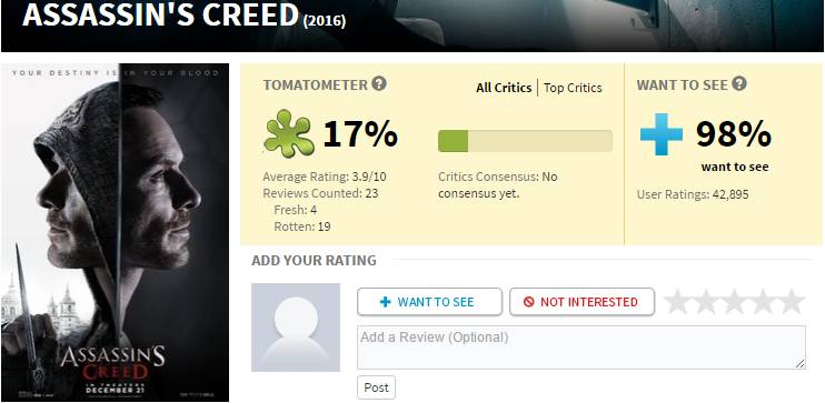 和部部赚钱的《生化危机》相比,《刺客信条》悲催地重演了《波斯王子》、《魔兽》等的悲剧——影片投资1亿多美元,然而北美票房只有惨淡的5000W,THR预估全球票房最终落点为1.5亿,预计将亏损7500万至1亿美元。收回成本遥遥无期,估计不会再有下一部了。