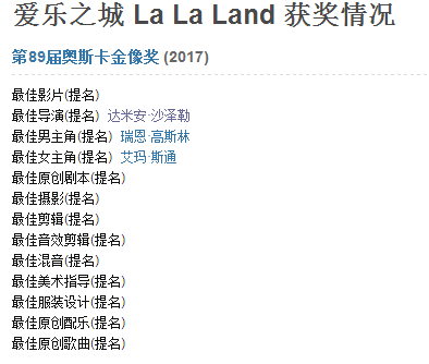 在第74届金球奖上,《爱乐之城》一举拿下了最佳音乐喜剧片、最佳音乐/喜剧片男女主角,最佳导演、最佳编剧、最佳原创配乐……