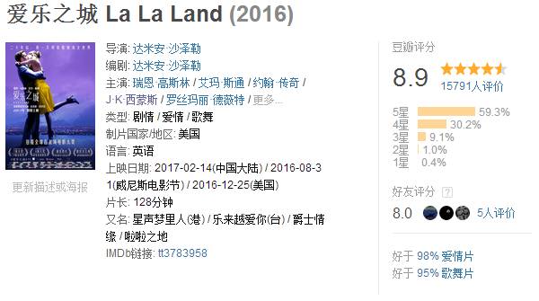 在奥斯卡提名名单上,《爱乐之城》更是一骑绝尘,遥遥领先,令其他电影都黯淡了许多。