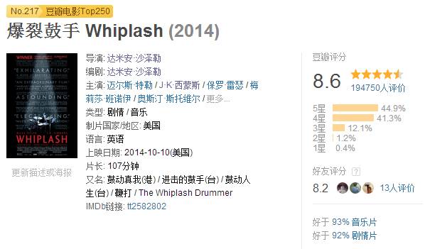 才华与颜值兼备的年轻导演达米安·沙泽勒,在拍这部拿奖拿到手软的《爱乐之城》前,他的上一部电影《爆裂鼓手》就已经大放异彩,获得了奥斯卡评委的青睐;观众口碑也极佳,杀入了豆瓣电影TOP250。