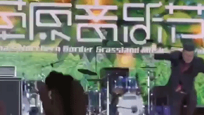 可他一高兴,就忘了脚下的音响,退着退着被音箱绊到,“咚”的一声直挺挺向后栽下去。