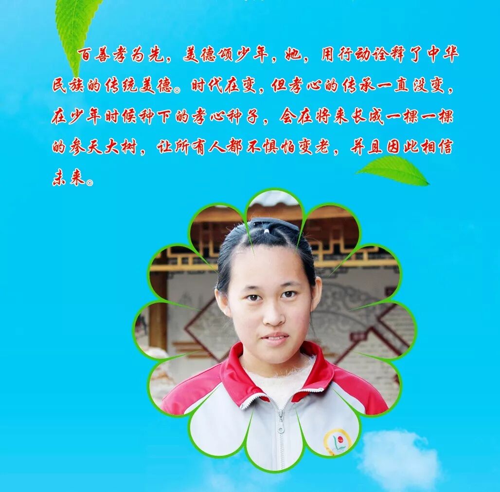 百善孝为先,美德颂中华。在贫困中,她任劳任怨,乐观开朗,用青春的朝气驱赶生活中的迷雾,在亲情中,她无怨无悔,让坚持传统的孝道充满每个细节。少年不畏艰难困苦践行孝心,她以乐观的心态和稚嫩的肩膀面去对学习与生活,用行动彰显“最美中学生”的风采。从不言苦,从不说累,为了亲人的微笑,为了未来的丰收,她孝心无限;学习上,她奋力争先,在她看来,优秀的成绩就是对父母最大的回报!