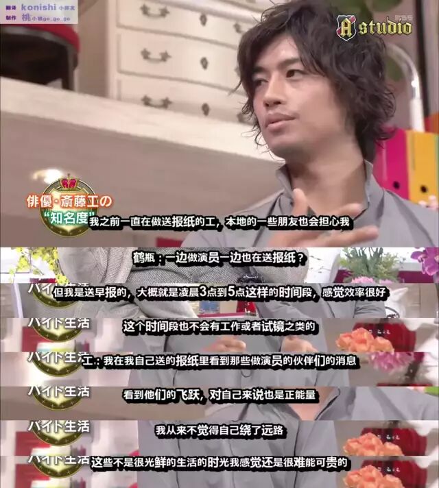 斋藤工在作为演员还没有走红的时候,也为了养活自己一边做着送报纸的工作。可贵的是他对打工经历的看法非常积极,这只是自己为了更好做演员的必经之路。