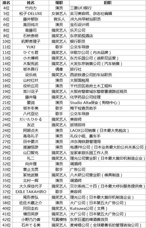 由于上榜的大多是我们不太熟悉的搞笑艺人,po便不按照排名逐一介绍了,不过乍看之下里面不乏一些很牛逼的职业和公司,因此辞职进入演艺圈,可见他们相当程度上的勇气与决心。