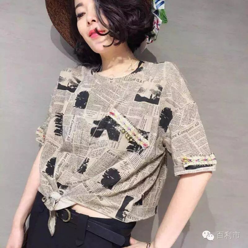 报纸印花露脐T恤,既时髦又百搭,高冷中透着点小性感。