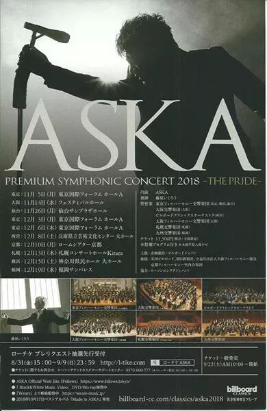 飞鸟凉终于不会再凉下去了,现在的他除了一连串的发片计划外,最重要的是在缓起诉刑期结束的现在,他终于可以展开一连串的回归巡演了!目前已经起跑的第一阶段演出《ASKA PREMIUM SYMPHONIC CONCERT 2018-THE PRIDE-》,到年底前在日本共有10场演出,明年2月份开始将会进行第二阶段更大型的巡演《ASKA CONCERT TOUR 2019 Made in ASKA - 40年のありったけ -》,目前已经排定了14场的演出。