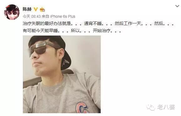 今天早晨,陈赫在微博发文称“治疗失眠的最好办法就是。。。通宵不睡。。。然后工作一天。。。然后。。。有可能今天能早睡。。。所以。。。开始治疗。”