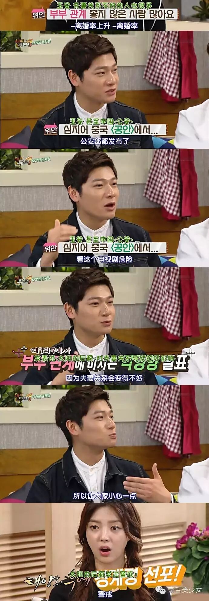 《非首脑会谈》时期喜欢的张玉安前阵子上《Happy Together》夸《太阳的后裔》的一段话直接让我转了路人,是,确实是有夫妻因为宋仲基吵架的新闻,但别描述得跟天朝遍地脑残似的行不行?扯离婚率让嘉宾一脸懵逼有意思吗?