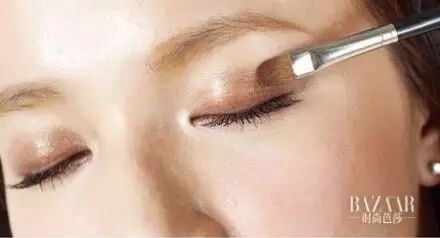 Step1:在上眼皮根部涂上咖啡色眼影,笔刷向上晕开,眼影范围不要超过眼窝。
