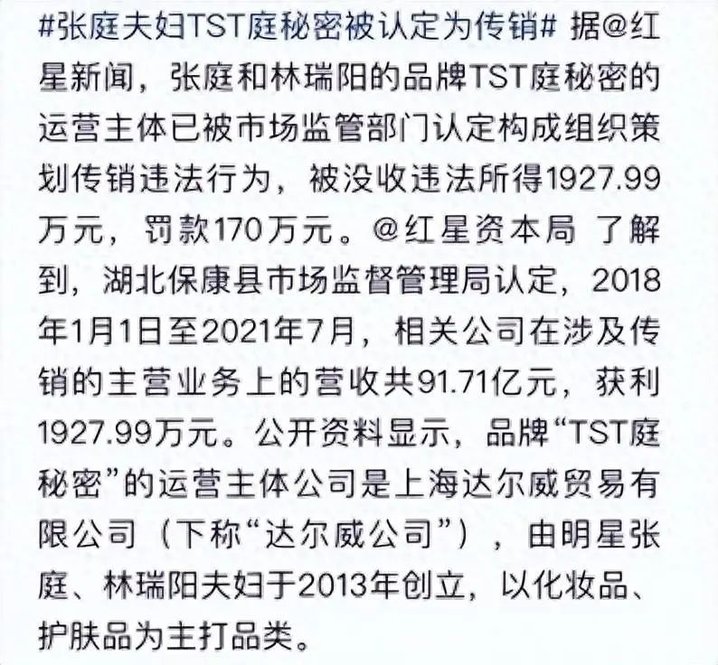 张庭和林瑞阳创办的“TST庭秘密”主推护肤、保养产品,依仗明星身份以及恩爱形象对外营销,短短一年时间就在朋友圈火爆。